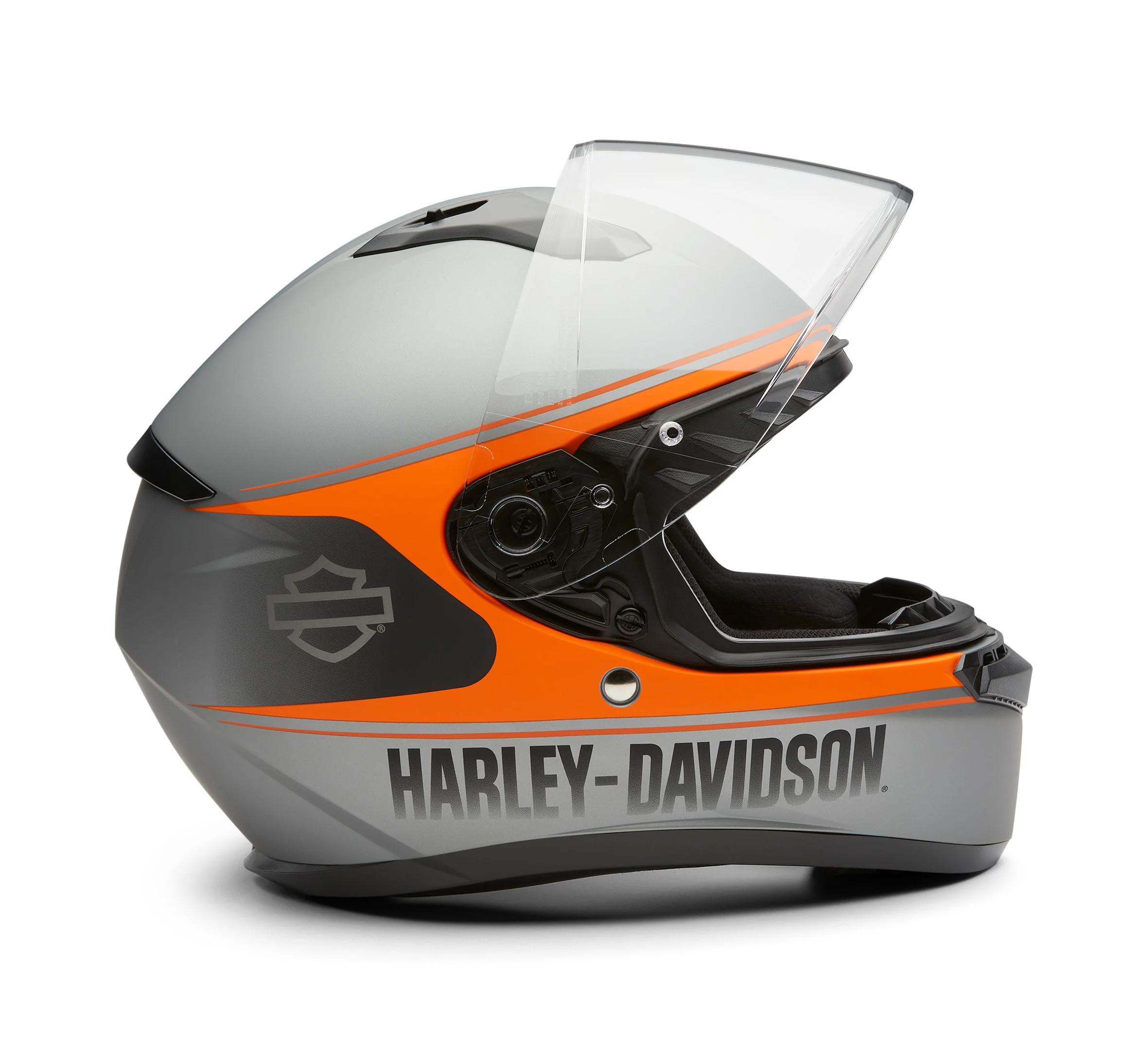 Vibrant styling meets go-the-distance comfort in our newest H-D® Velo H34 Full Face Helmet. Built from a polycarbonate composite for a superior, lightweight fit, its certified design wisely features an advanced channeling ventilation system that fully flushes out heat and humidity as you ride. This full face motorcycle helmet has a rear spoiler to reduce drag, grooves to accommodate eyewear, and an anti-scratch face shield with 99% UV protection. The Matte Metallic Charcoal finish complements its bold colors and graphics for a contemporary H-D look. Learn more in the specs below, then snag yours while supplies last.