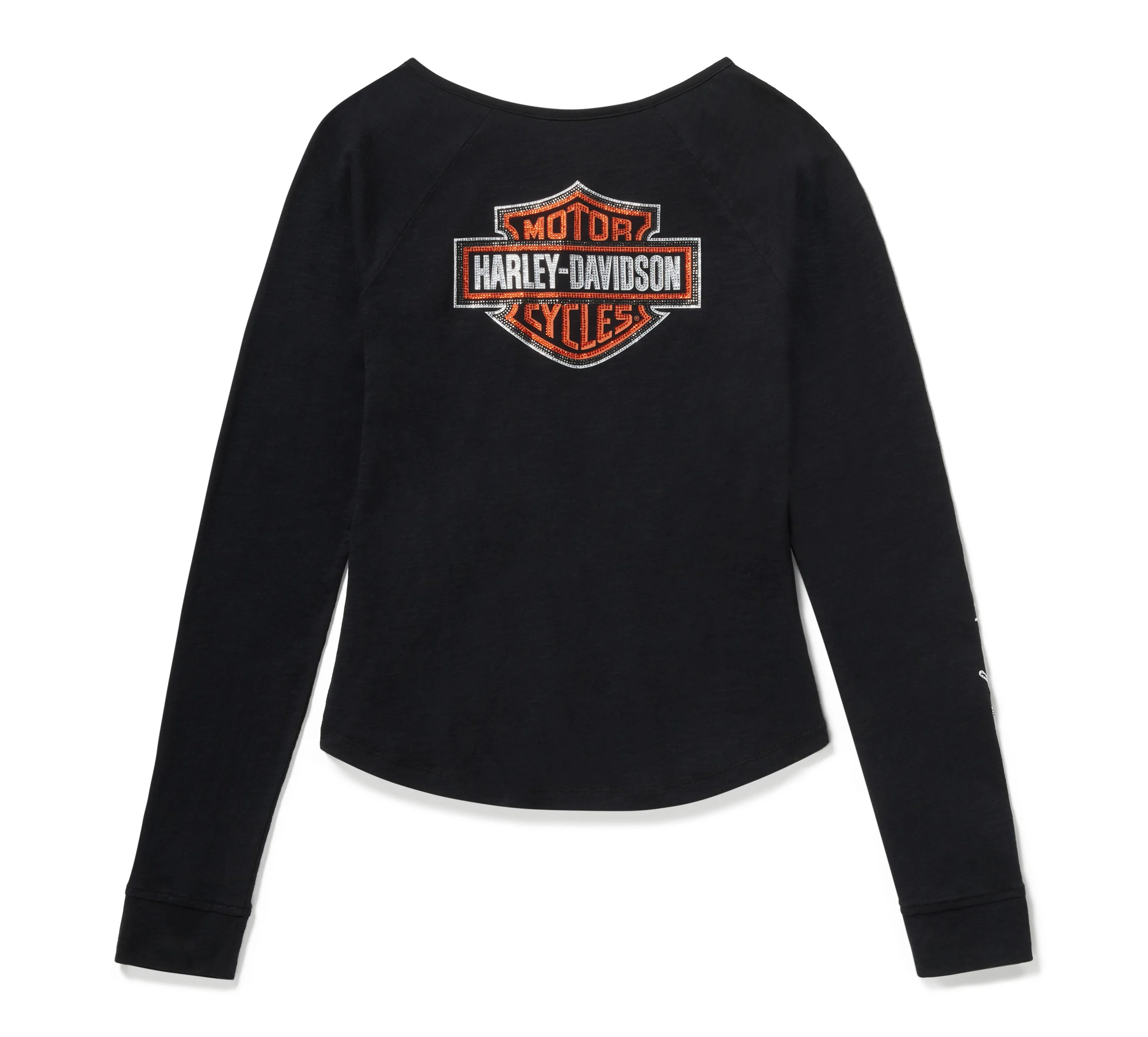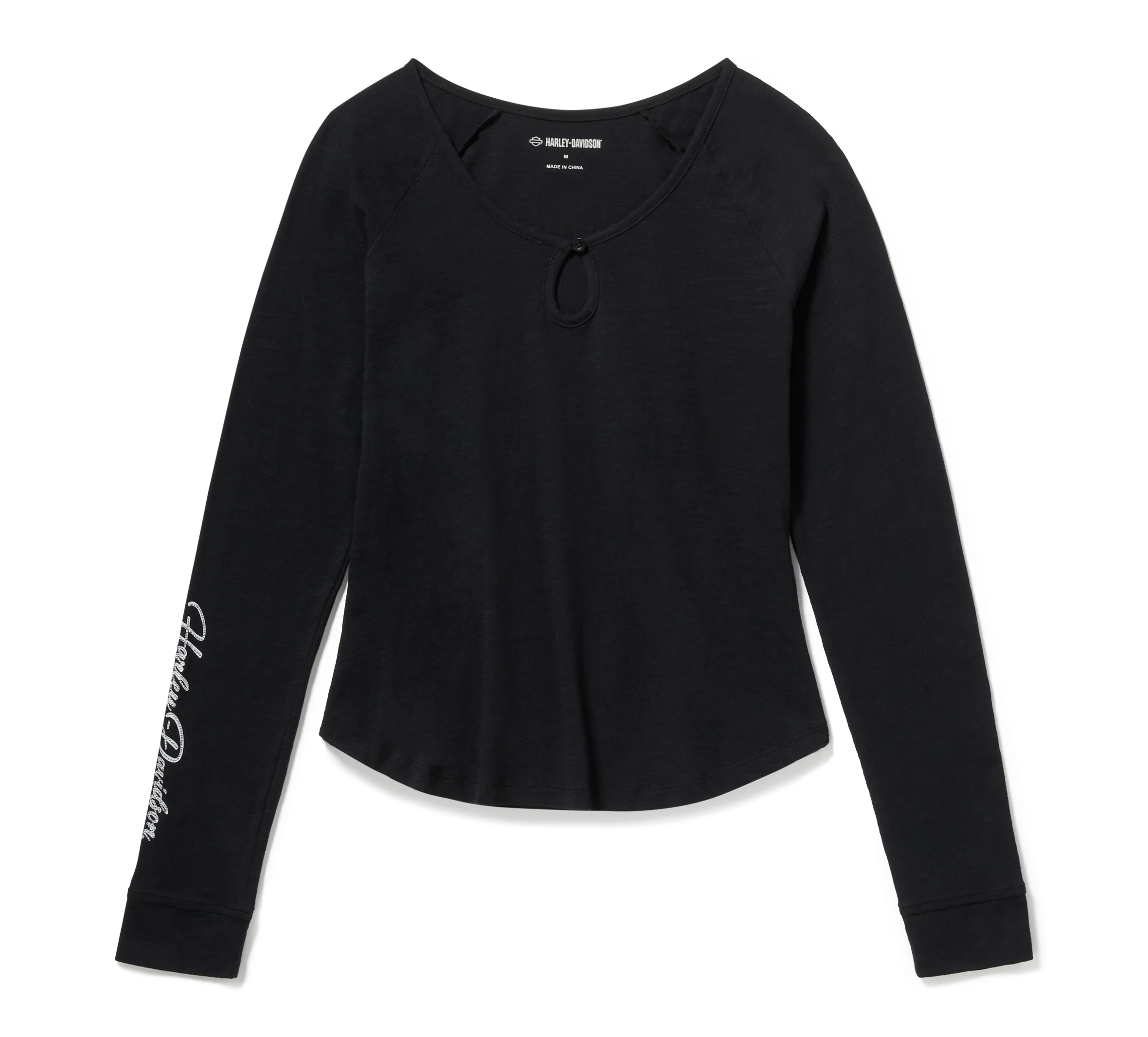 Elevate your casual style with our Essential Bling Keyhole Henley. It’s crafted from super soft cotton slub jersey for a subtle textured appearance. This long sleeve women’s top features a flattering one-button keyhole neckline plus a shirttail hem that visually lengthens the leg line. Rhinestone-embellished graphics ride down one sleeve and are parked on back for a shimmering H-D look.
