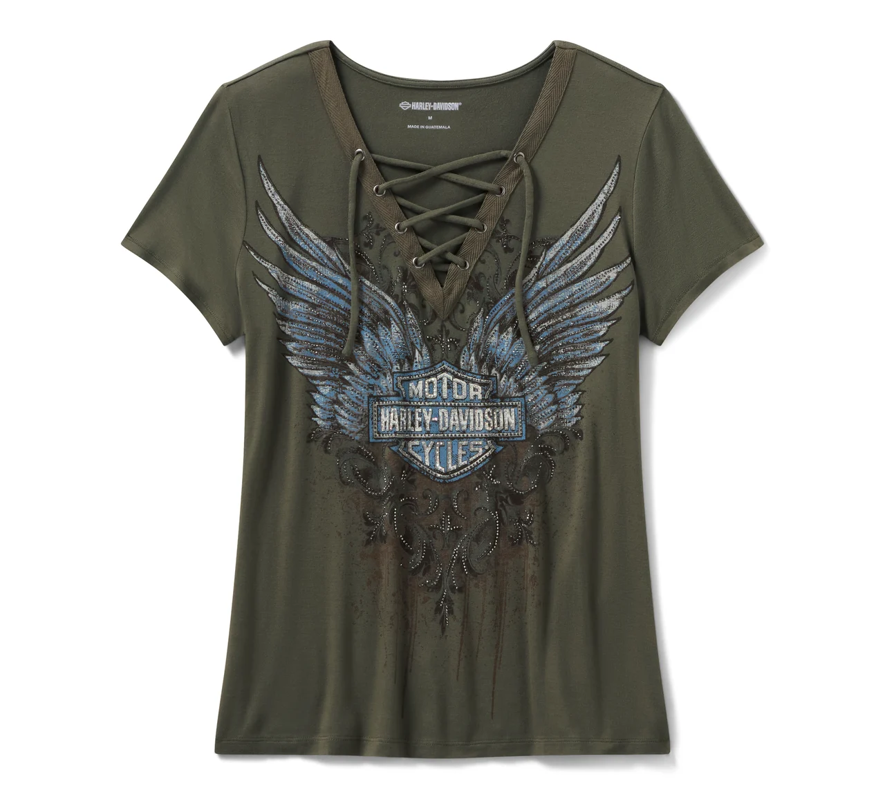 Earn your wings for fiercely beautiful style in our special-issue Bling Dark Angel Short Sleeve Laced Front Tee. Crafted from a 225-gsm cut of super soft rayon jersey with a hit of spandex for added stretch, it features an attractive V-neckline with crisscross lacing and metal grommets. This women’s t-shirt is finished with a striking wingspan design layered with rhinestones. Get yours ASAP.