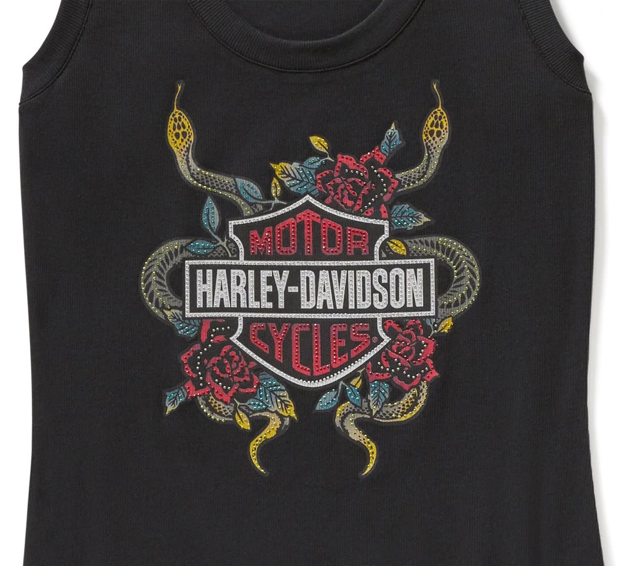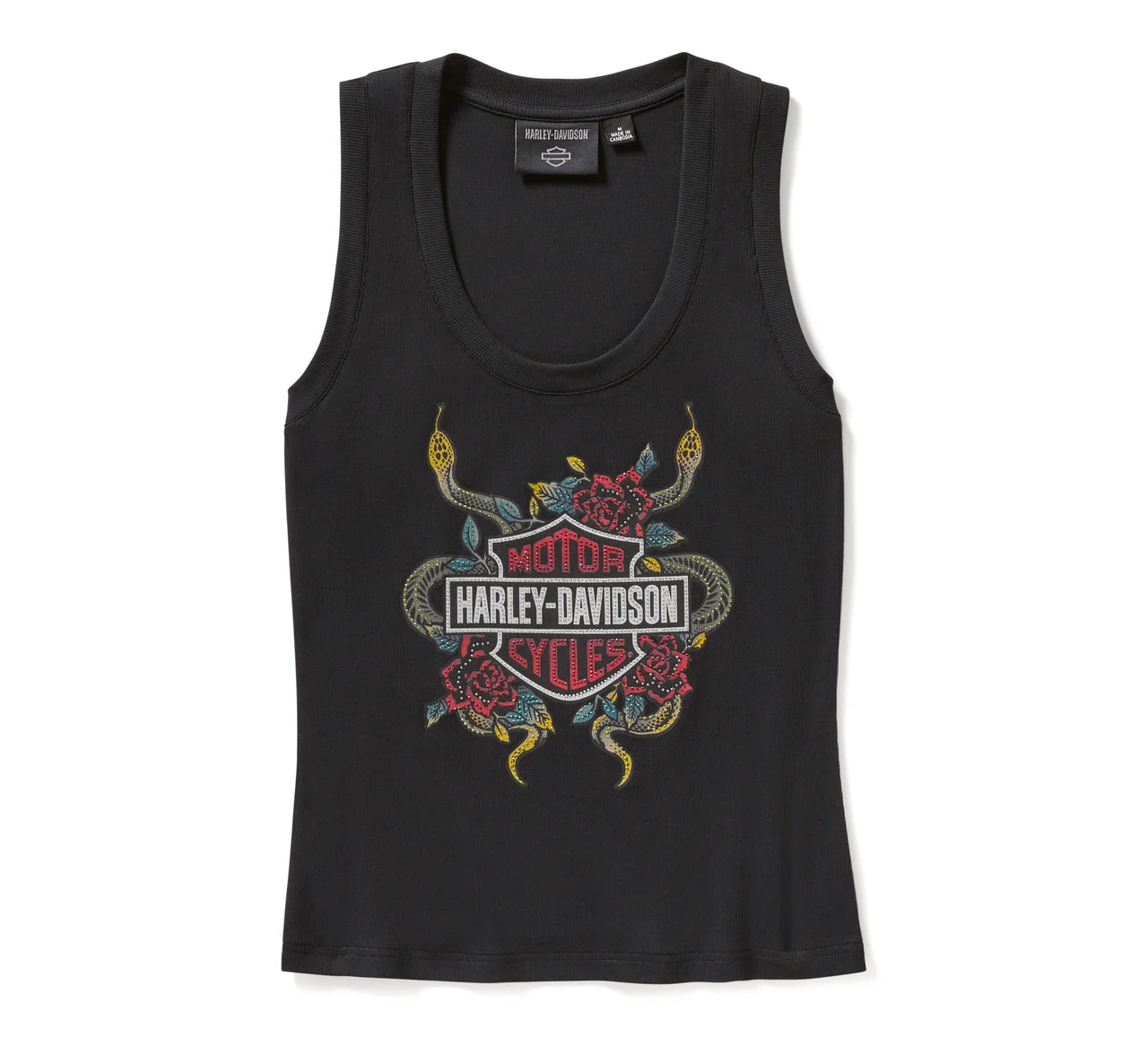 Your stay-cool style gets a shimmering edge in our Serpent Rose Bling Ribbed Tank. Its cotton/modal blend is soft, breathable, and moisture-wicking plus ribbed for a textured look. This women’s tank top features a flattering scoop neckline and a striking reptile-meets-rose design adorned with rhinestones.