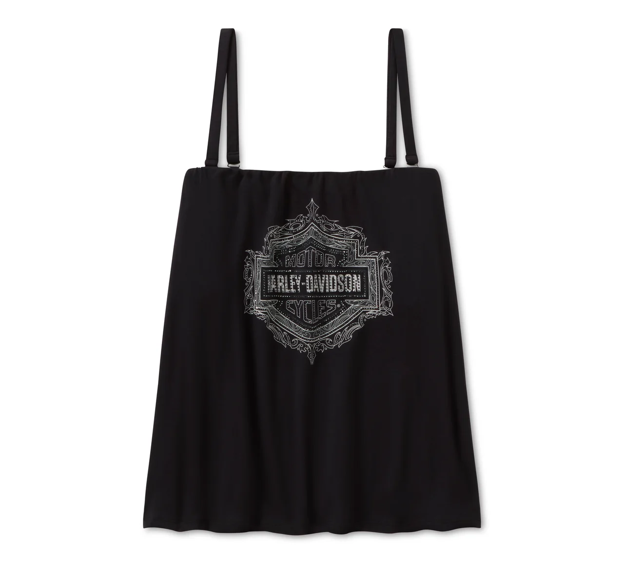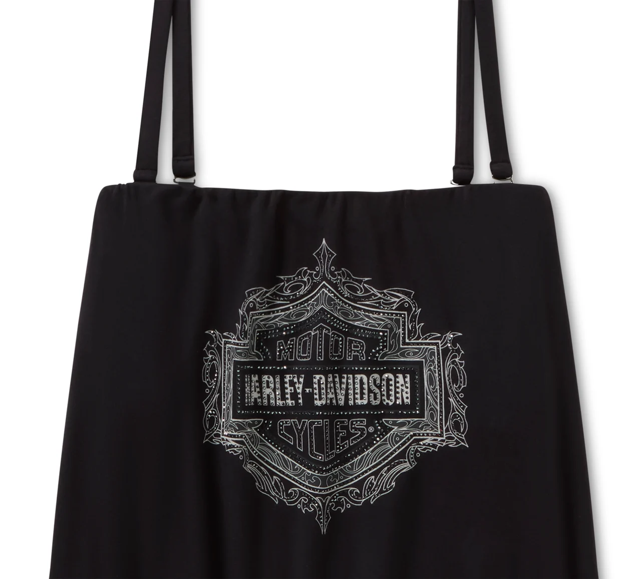 Sexy style with an edge is here on our Bling H-D® Cheers Strapless Tank. This special issue is a perfect pick for holidays and every day in between with its 225-gsm rayon jersey build that has a super soft feel and hit of spandex for added stretch. Its blousy silhouette and interior bra shelf deliver relaxed, longwearing comfort while the removable spaghetti straps give you two flattering looks in one top. Finished with an ornate take on our iconic Bar & Shield that’s meticulously layered in rhinestones. Get yours before they’re gone.