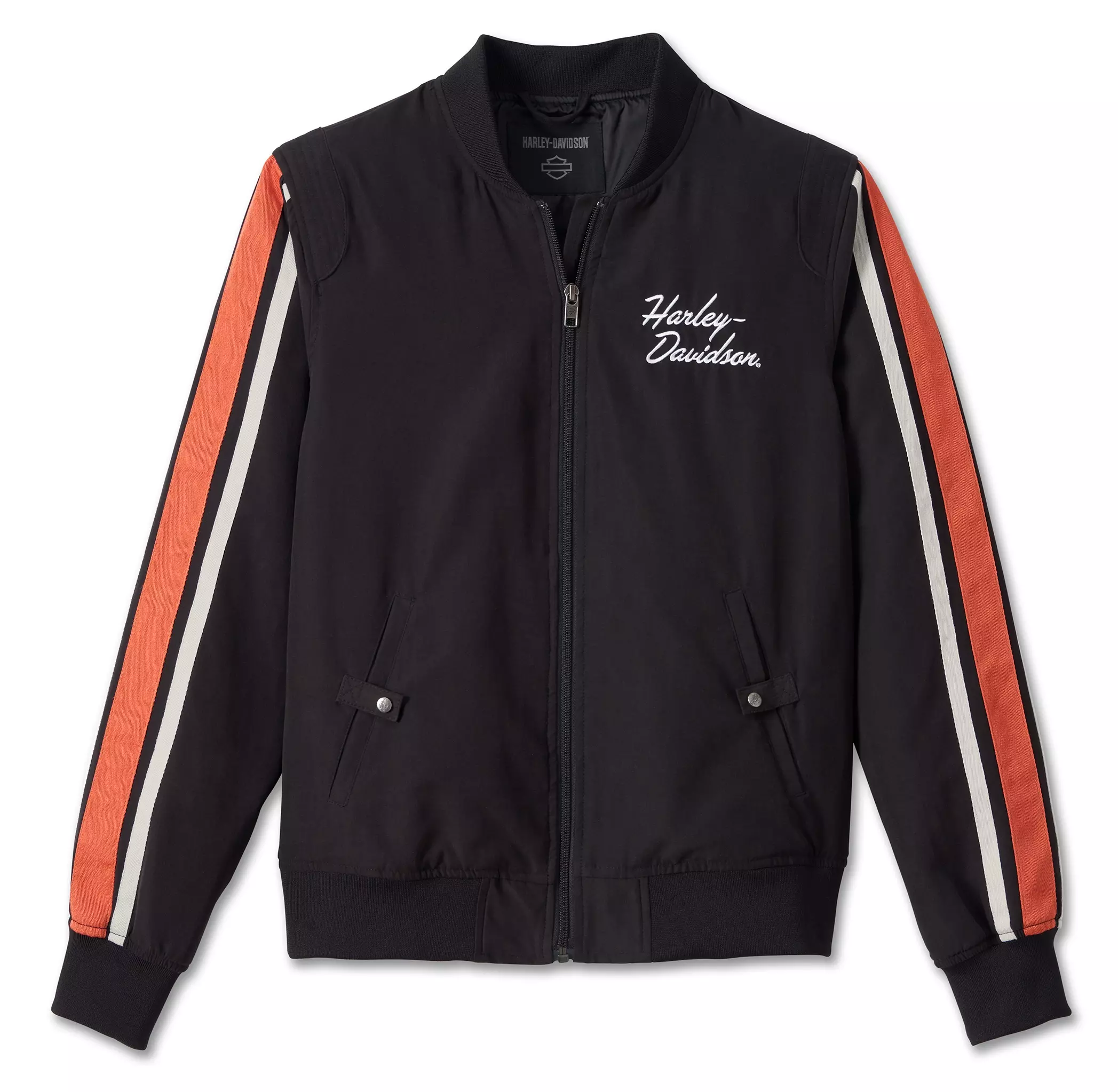 • Design Details: Contrast sleeve taping. Rib-knit collar, cuffs, and waistband. Shoulder piecing with multi-track stitching.