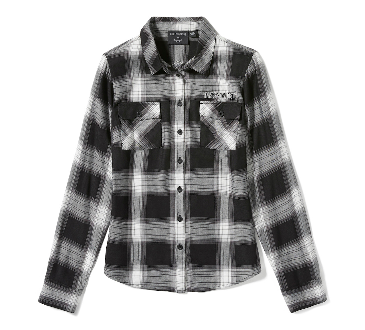 Kee your moto style effortless in our Essential B&S Woven Plaid Long Sleeve. Crafted from viscose twill that’s washed for softness, it’s a wear-all-day pick that feels weightless and drapes beautifully. This long sleeve women’s button down features shape-flattering bust darts and a shirttail hem, plus a hidden snap-down collar that stays put under riding gear. It’s finished with our namesake embroidered on front and an appliqué of our iconic Bar & Shield filling the back.