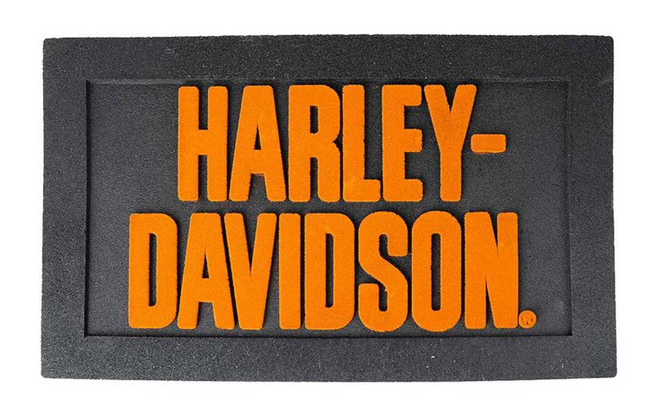 Non-slip, durable rubber entry mat with orange flocked Harley-Davidson font.