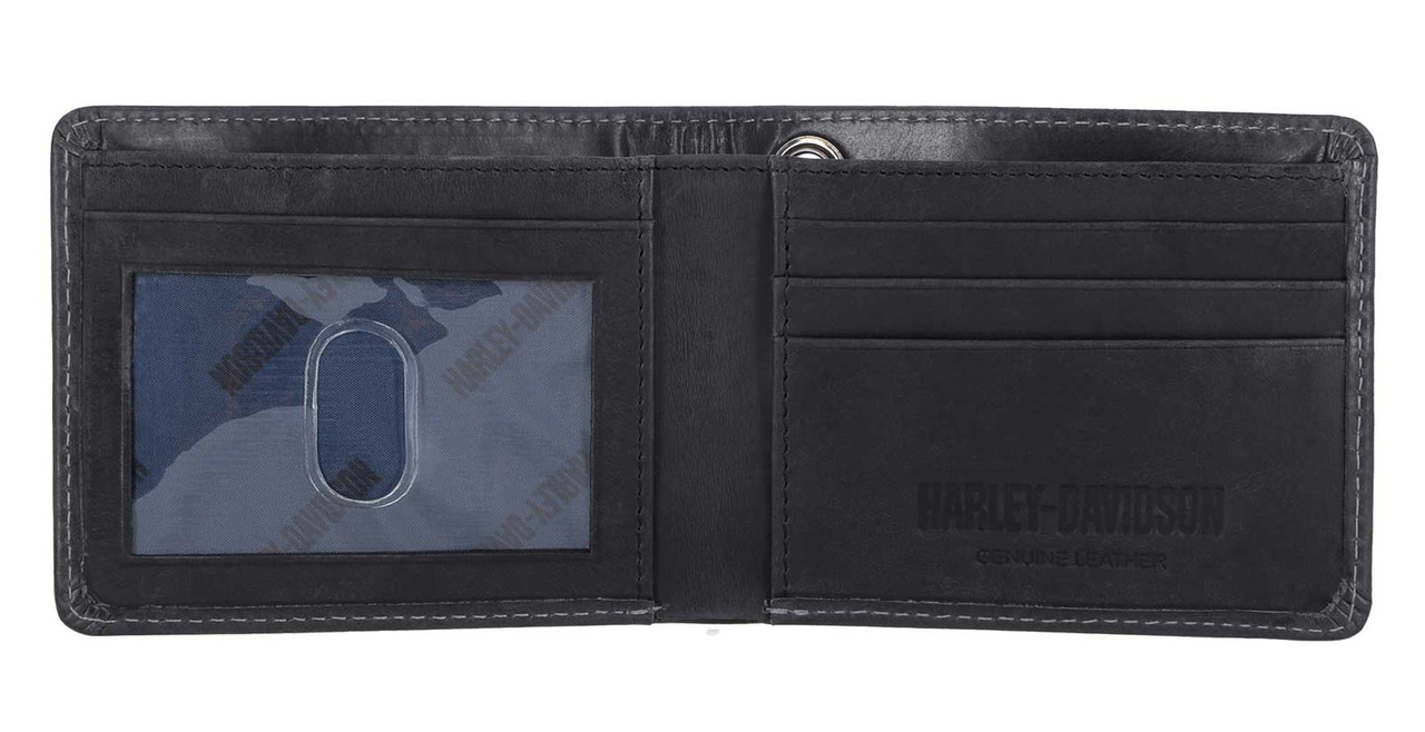 Heat embossed Willie G Skull logo. Interior features ID window, card slots and cash slot. H-D logo lining.