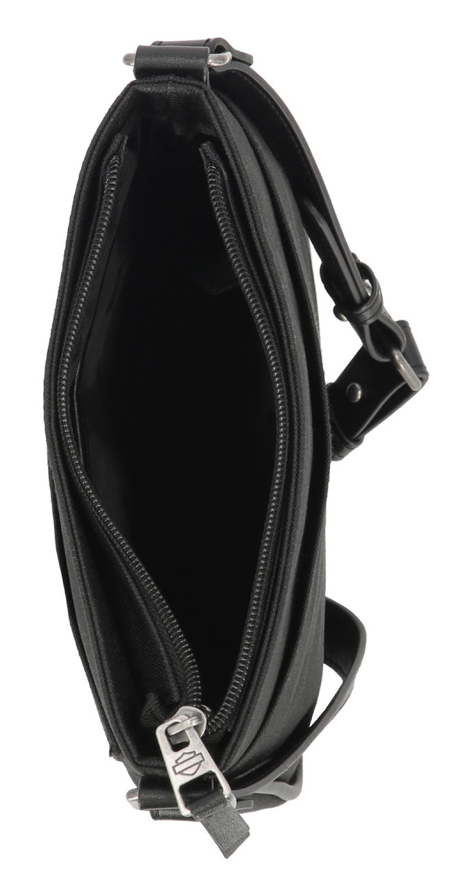 Harley-Davidson® Women's Rhinestone Embellished Bar & Shield Crossbody Bag, Black. Polyester. Top zipper entry. Rhinestone Bar & Shield logo. Exterior front slip pocket. Exterior back slip pocket. Interior front slip pocket. Interior back zipper pocket. Adjustable shoulder strap. Adjustable shoulder strap. Size: 19 x 11,25 x 4 CM.