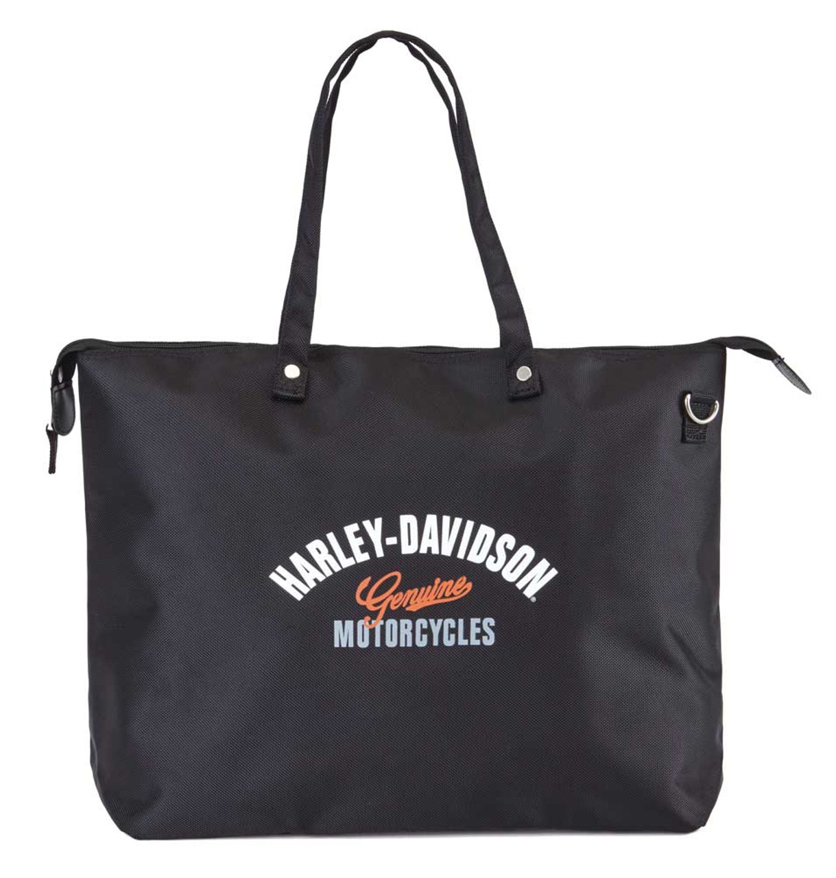 Harley-Davidson® Foldable Black H-D Script Light-Weight Travel Tote, 99203-BLACK. Great for travel or for everyday use as a large tote bag. Matches with Wheeling Plane Case (99818) which is sold separately, but is a great item on it's own! Can piggyback on the handle of the Wheeling Plane Case. Easy access opening, with a top zipper, and handles for convenient carry. A nice lightweight bag! Size: 51 x 37 CM".