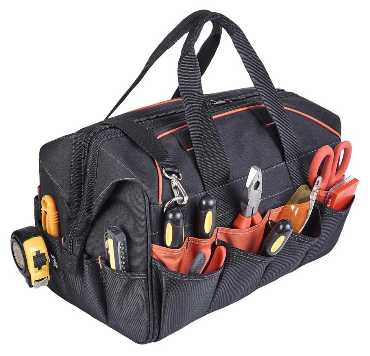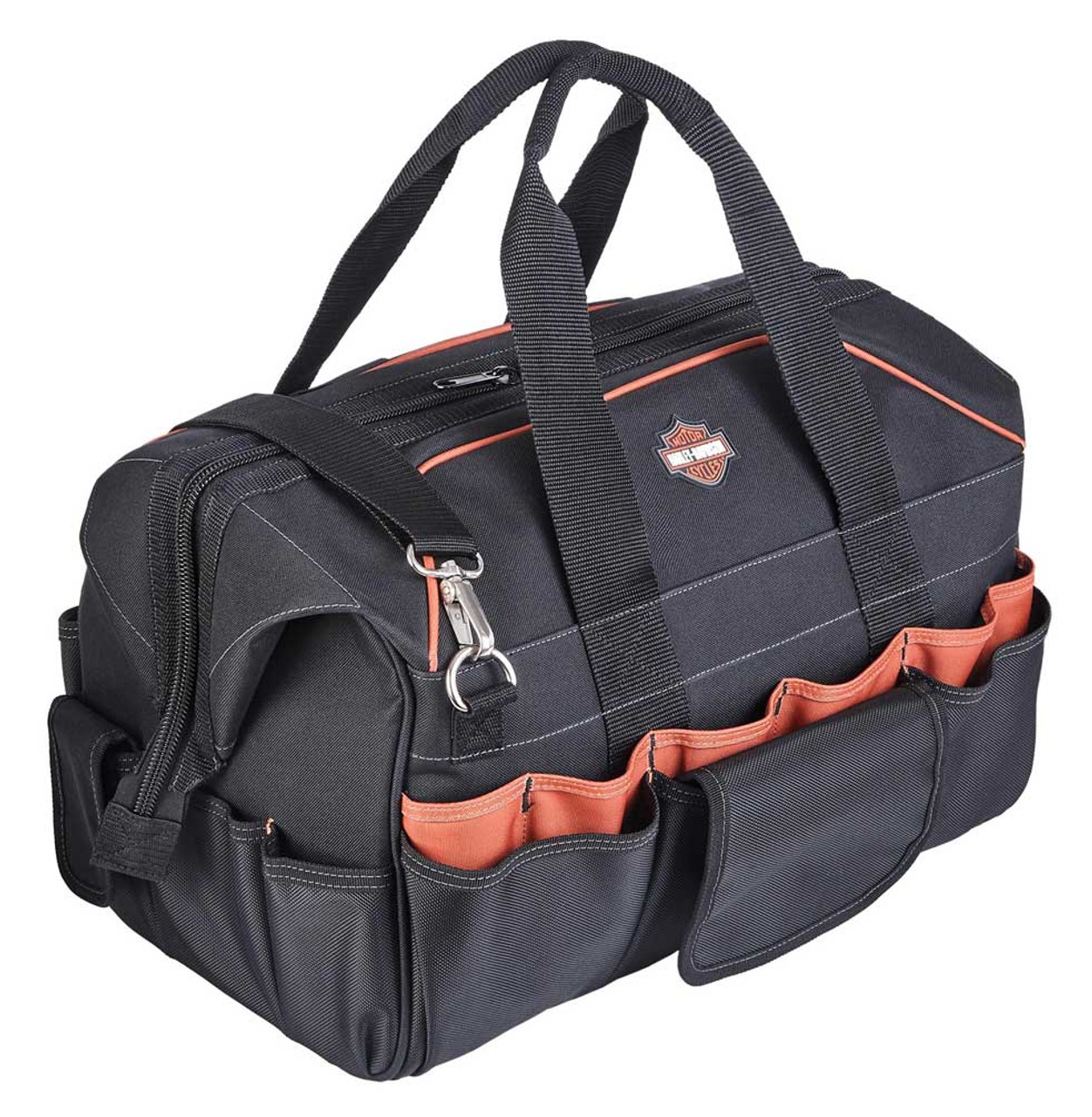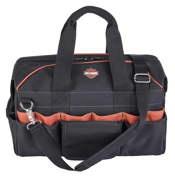 Harley-Davidson® 39 Pocket Tool Bag - Black, 99103-BLACK. Great for organizing your tools with lots of versatile organizing options. Pockets include 14 interior wall pockets and 25 exterior pockets. Heavy gauge metal clip on outside for tape measure or other essential tools. Main section with wide "doctor's bag" opening with metal hinge frame. Bag zips open with maximum visibility and ease of use. Constructed from industrial strength polyester body fabric. Extra large nylon coil industrial strength zipper closure. Dual zip pulls for effortless use. Detachable and adjustable comfort shoulder strap. Closed Size: 45 x 25 x 28 CM. Opened Size: 45 x 25 x 35,5 CM.