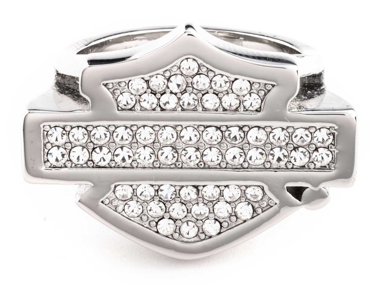 Harley-Davidson® Women's Paved Crystal Ring. Add a touch of bold elegance to your look with the Harley-Davidson® Women's Crystal Ring. This stunning piece features a timeless Bar & Shield logo sparkling with a brilliant crystals. Expertly crafted from high-polish sterling silver, this ring perfectly balances strength and sophistication. A must-have addition to any Harley-Davidson® jewelry collection. Size 6: 34R00487, Size 7: 34R00488, Size 8: 34R00489, Size 9: 34R00490.