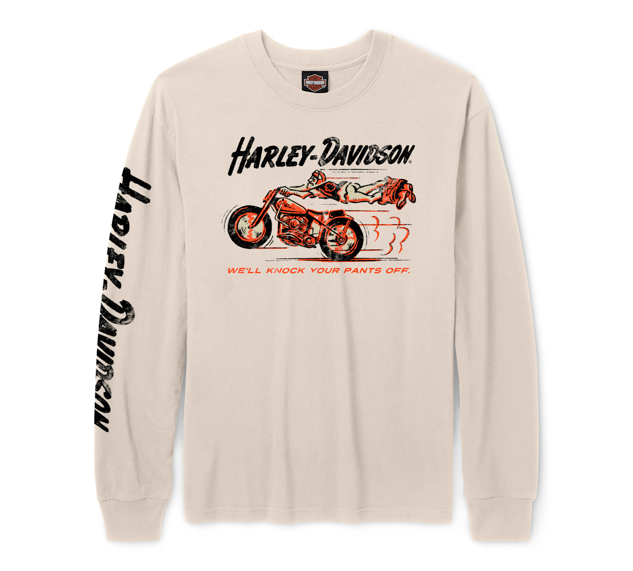 The rush of the open road comes alive on our special-issue H-D® Knock Your Pants Off Long Sleeve Tee. It’s built for longwearing comfort from super soft cotton/polyester jersey with rib-knitting on the neckline and cuffs to help keep its shape. It’s finished with custom cheeky artwork on front and our namesake riding down one sleeve, all distressed for a retro look. Snag yours ASAP.