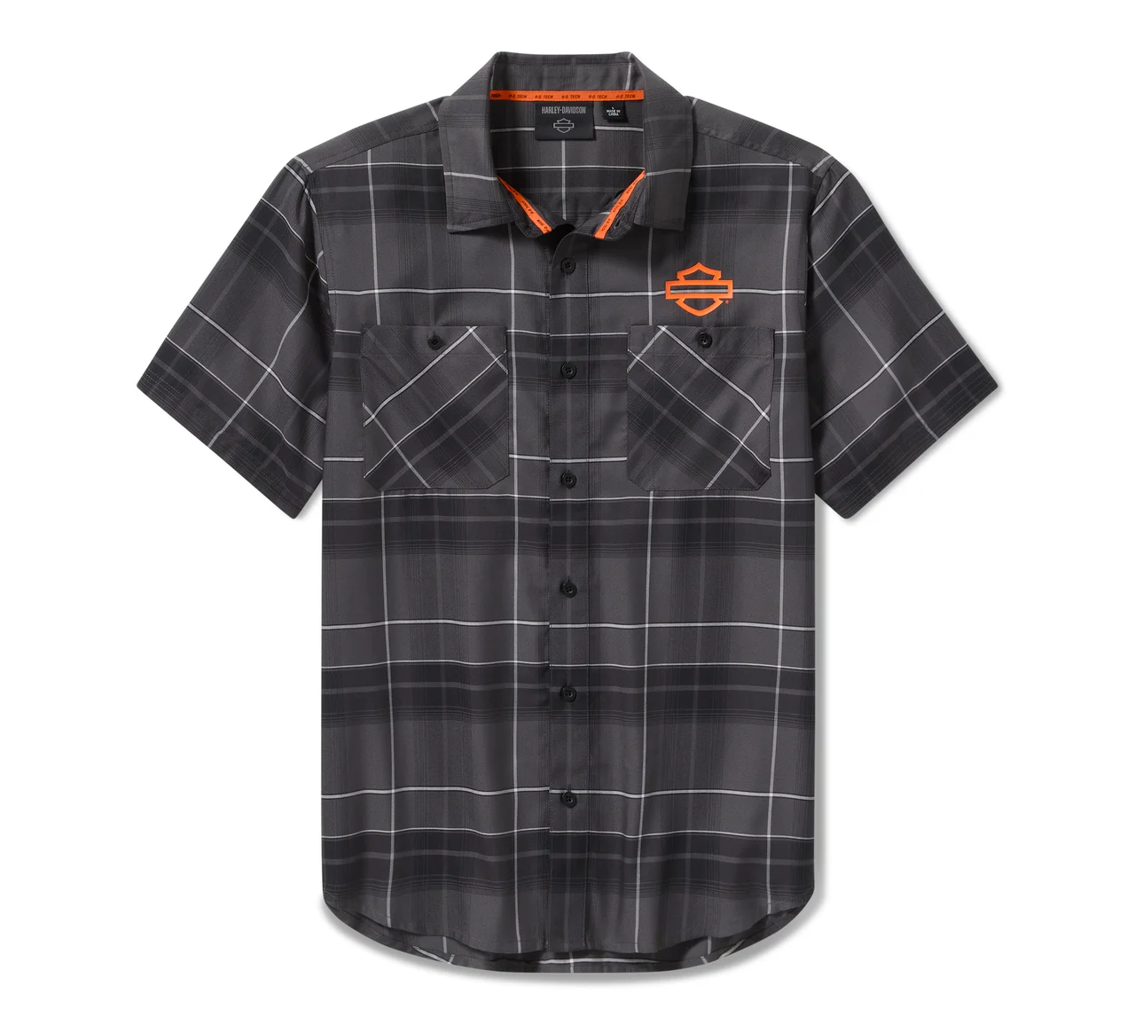 Stay cool, look cool. This men’s short sleeve button down is crafted from polyester Coolmax® to wick moisture and dry quickly. Our H-D® TECH Coolmax® Plaid Shirt features a shirttail hem that looks great tucked in or out, a handy pen stall on the left chest pocket, and a hidden snap-down collar that doesn’t flap around under riding gear. Its vibrant plaid pattern and printed graphics deliver a more contemporary H-D look.