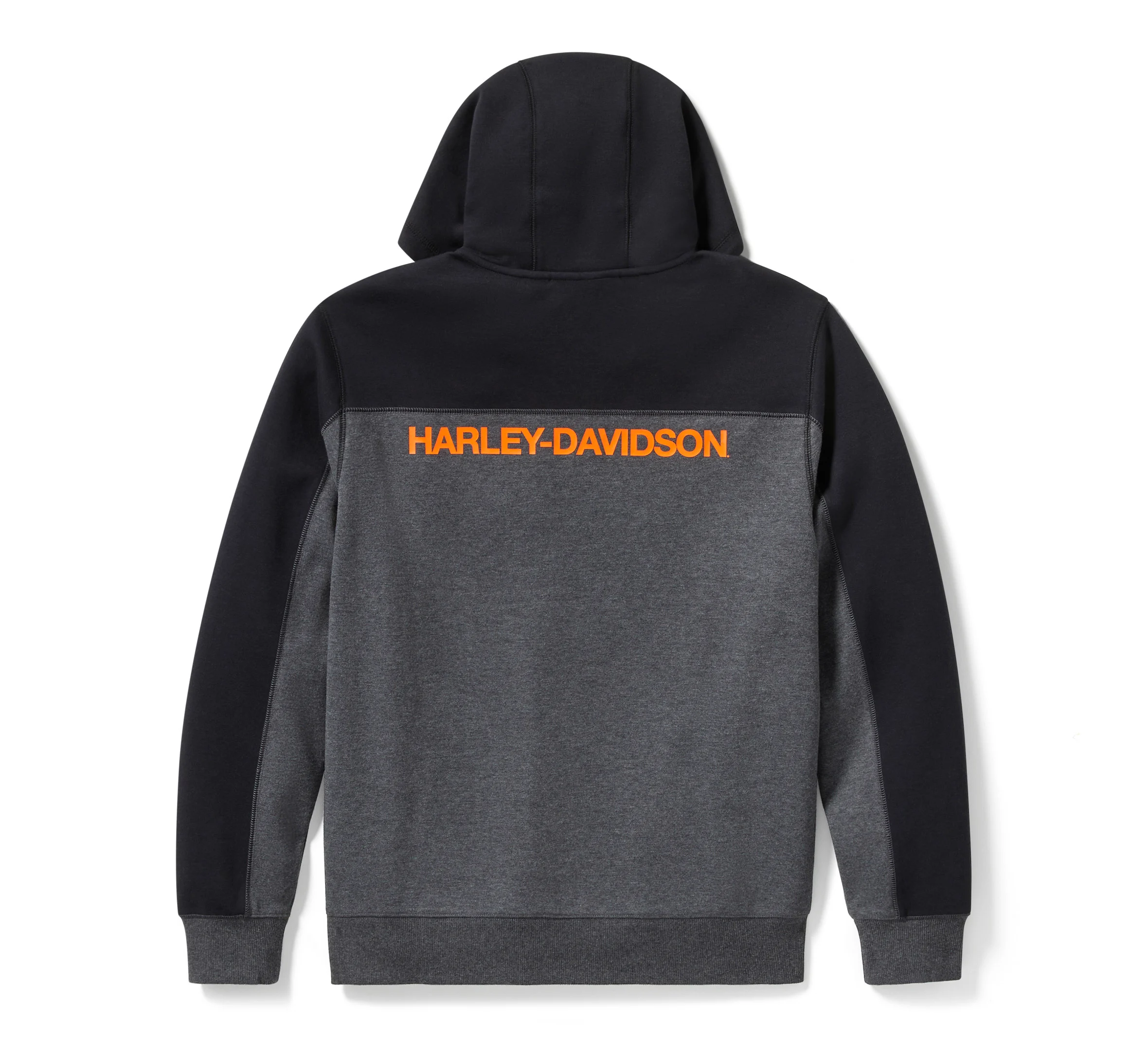 Vibrant moto style takes a sensible turn on our H-D® TECH Gaiter Full Zip. Made durable yet comfortable from a heavyweight cotton/polyester interlock in a relaxed fit. It features a built-in neck gaiter to wear over your mouth and nose to block wind or repel dust and bugs, making it a practical pick under your riding gear. This zip-front men’s hoodie is finished with our contemporary graphics plus a colorblock design that pops.