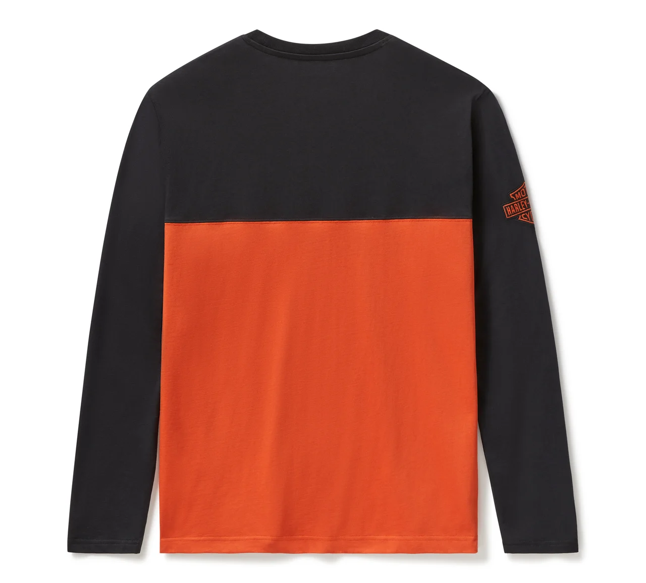 Vibrant moto style goes all in on our Essential Colorblock Long Sleeve Top. It’s made from soft, breathable cotton jersey that’s enzyme stone washed for a well-worn look and feel. The contrast fabric piecing on this men’s long sleeve t-shirt complements our embroidered graphics for a colorful, perennial H-D look.