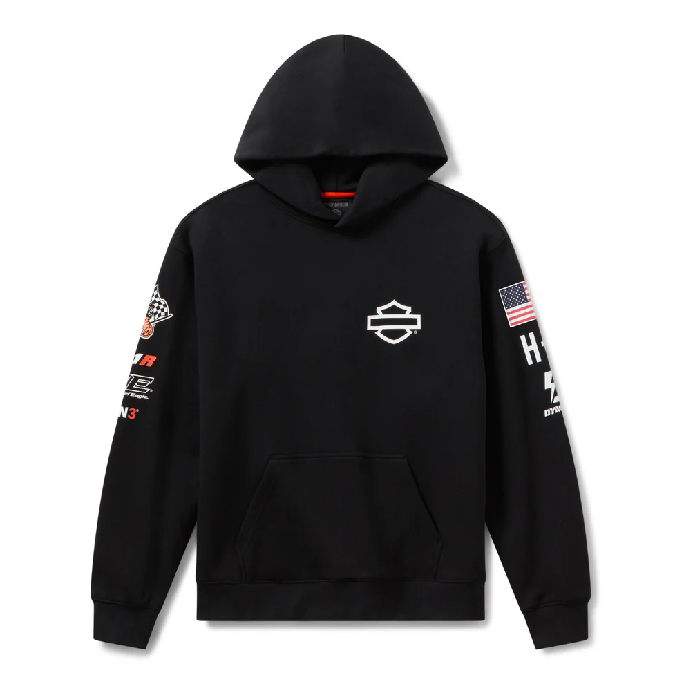 Relaxed-fit comfort is here on this Racing inspired Hoodie. Cut from 100% premium cotton Terry in 460 gr, it features a double layer drawcord-free hood and kangaroo pocket with a premium rib-knit trim to help keep its shape at cuff and body. Additional details include double top stitching reinforcement added at all main seams, internal orange contrast color jersey tape at inner back neck-seam, and soft-hand printed graphics on the front, back and sleeves.