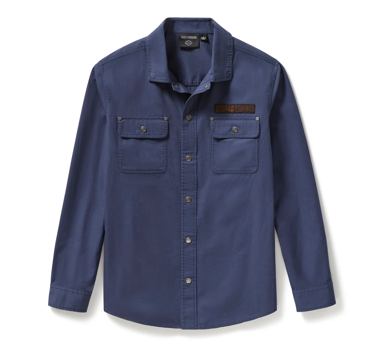 Your rugged, moto-inspired look is on point in our Working Man Twill Overshirt. It’s made from cotton poplin for a breathable, smooth feel that’s also washed for softness. This men’s long sleeve shirt features branded snaps and rivet detail for an elevated look, and a hidden snap-down collar that won’t flap around under riding gear. Oversprayed embroidered patches on the front and back add to its throwback, workwear vibe.