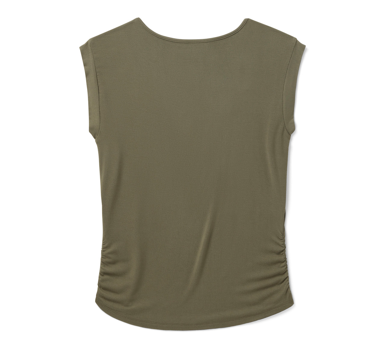 Wide scooped, notched neckline. Set-in armbands. Side seam ruching. Turnback hem.