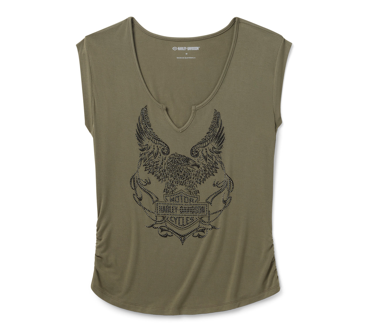 Your moto-loving style soars in our Bling H-D® Born to Fly Notch Neck Muscle Tee. This special issue is built from a 225-gsm rayon jersey for a super soft feel and longwearing comfort with a hit of spandex for added stretch. Designed to flatter your figure, this women’s sleeveless t-shirt features a scooped, notched neckline and side seam ruching. Its exclusive, rhinestone-drenched artwork is inspired by our circa 1976 Bar & Shield eagle design created for the U.S. Bicentennial. Add this to your wardrobe before it’s too late.