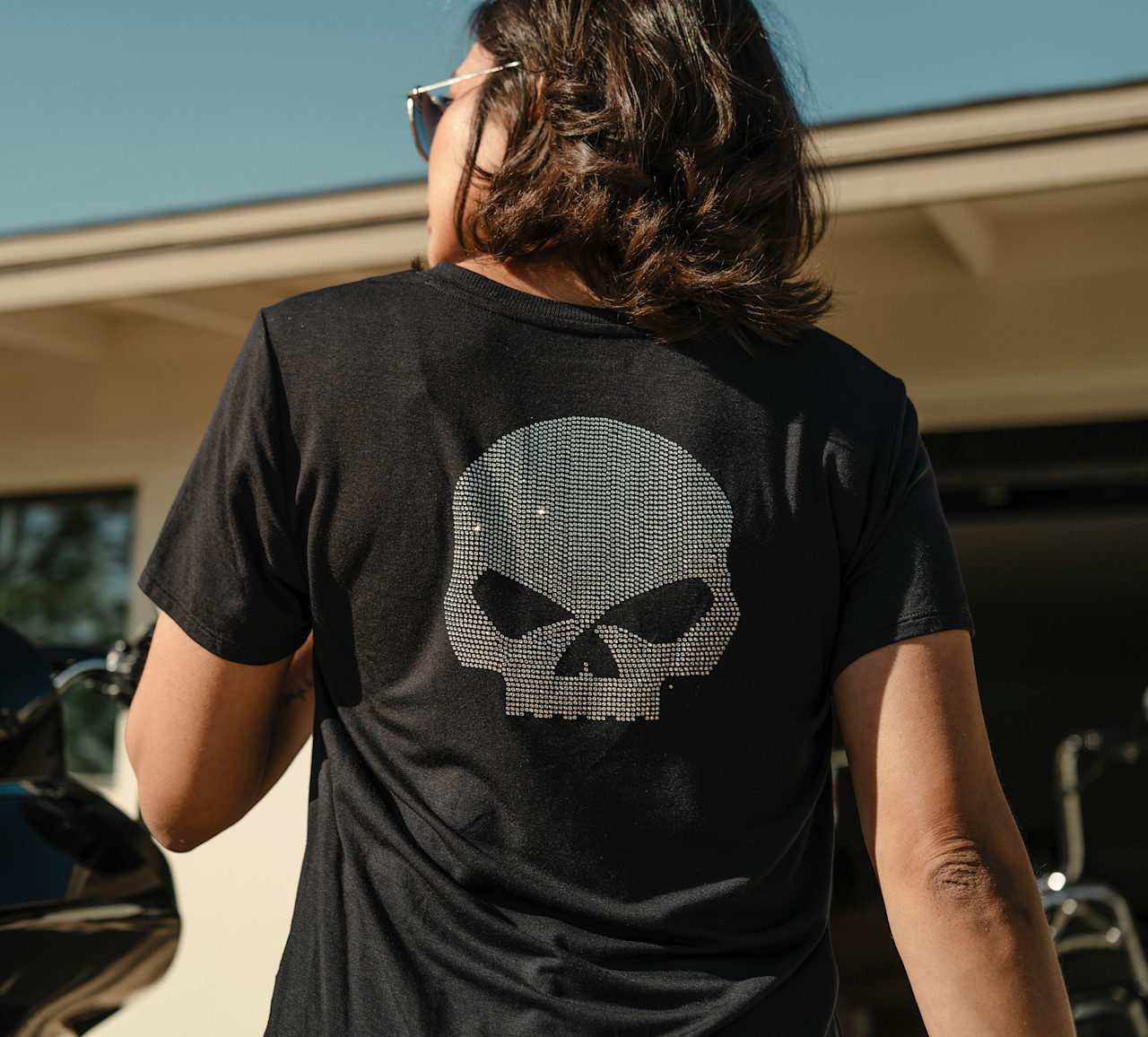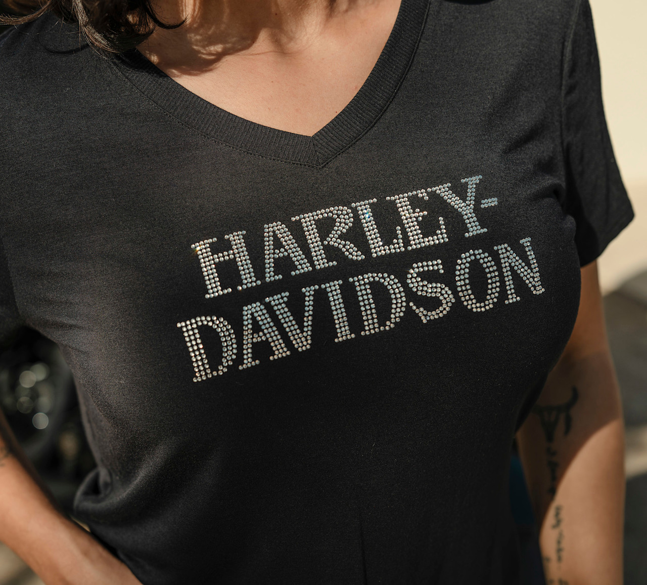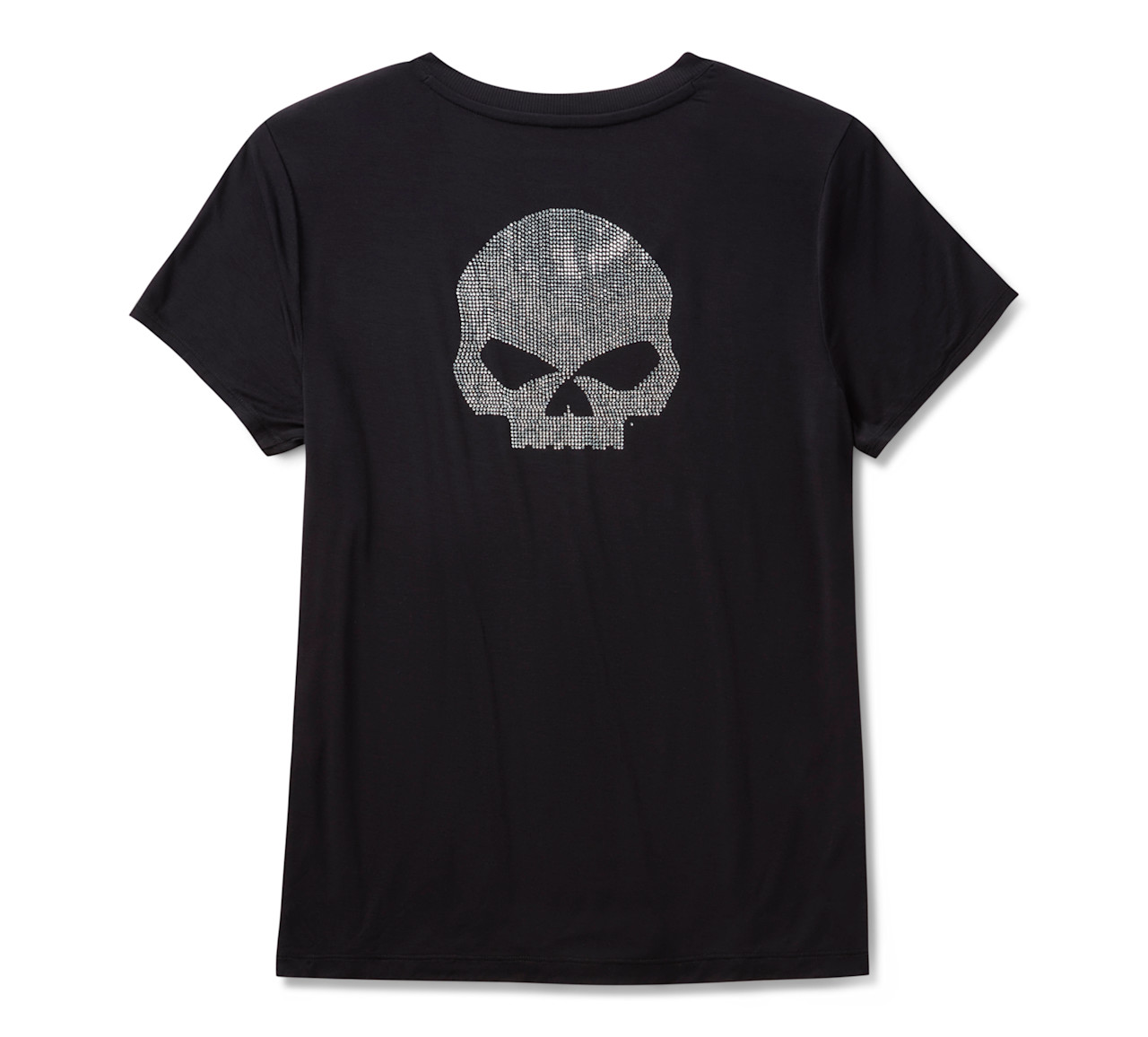 Elevate your casual look in the Willie G™ Skull Bling V-neck. Made for longwearing comfort from super soft rayon jersey with a hit of spandex for added stretch. This women’s t-shirt features a flattering V-neckline and stunning rhinestone graphics spotlighting the iconic Willie G Skull. Know the history—though the Skull is one of his most popular creations, Willie G. Davidson also designed several motorcycles, including the 1971 FX Super Glide® model and the 1977 FXS Low Rider® model.