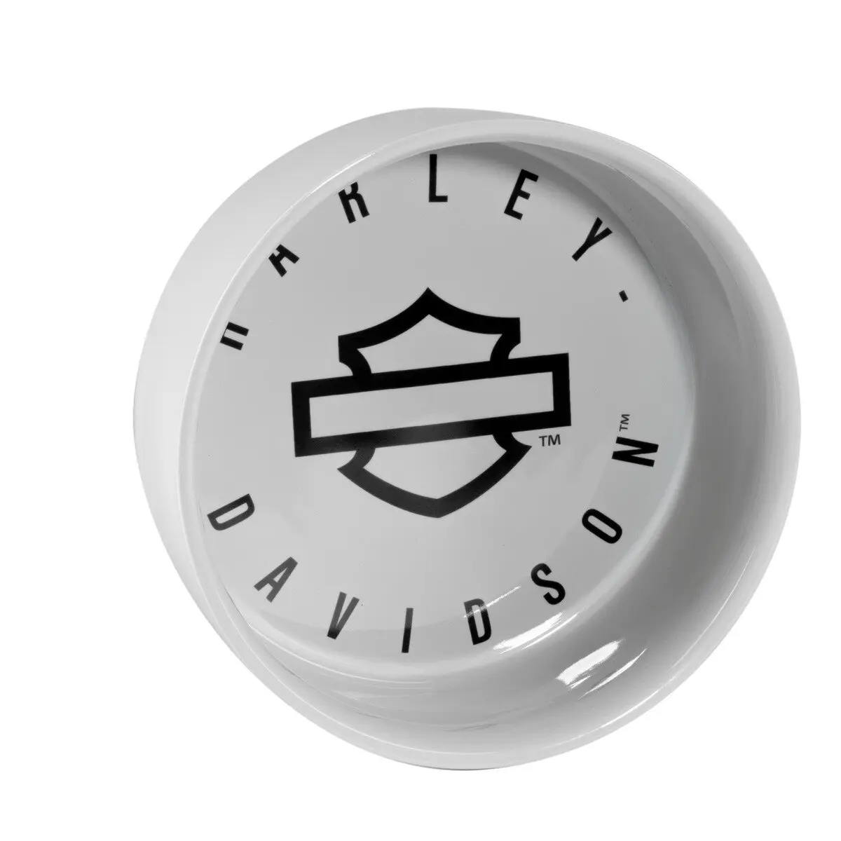 Custom white ceramic bowl with sculpted Open Bar & Shield logo on the front and decal logo on the inside.