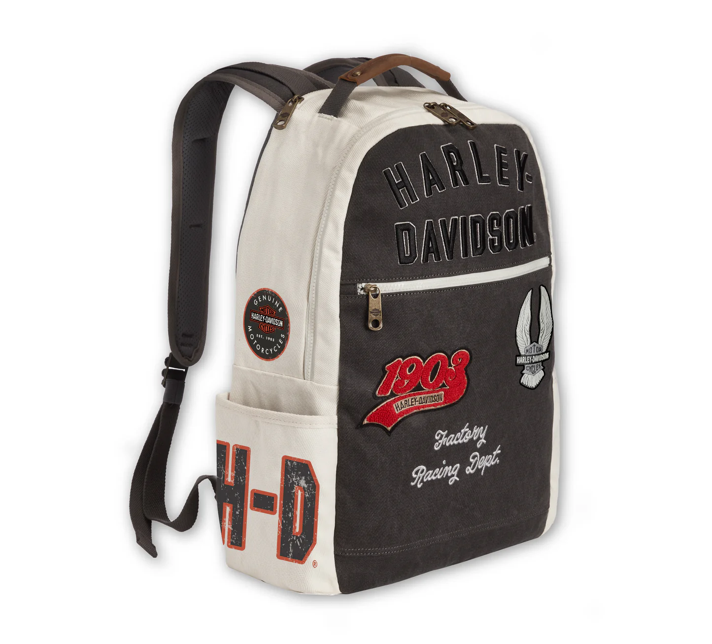 Iconic Design: Showcases multiple patches and prints, including the legendary Harley-Davidson® script, Bar & Shield® Eagle, "1903," and Factory Racing Dept. graphics.