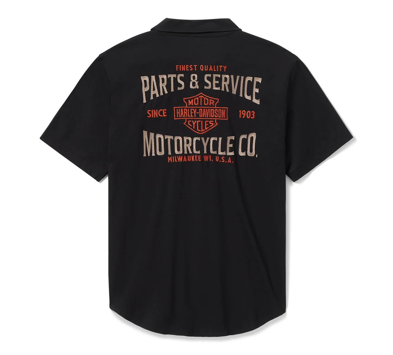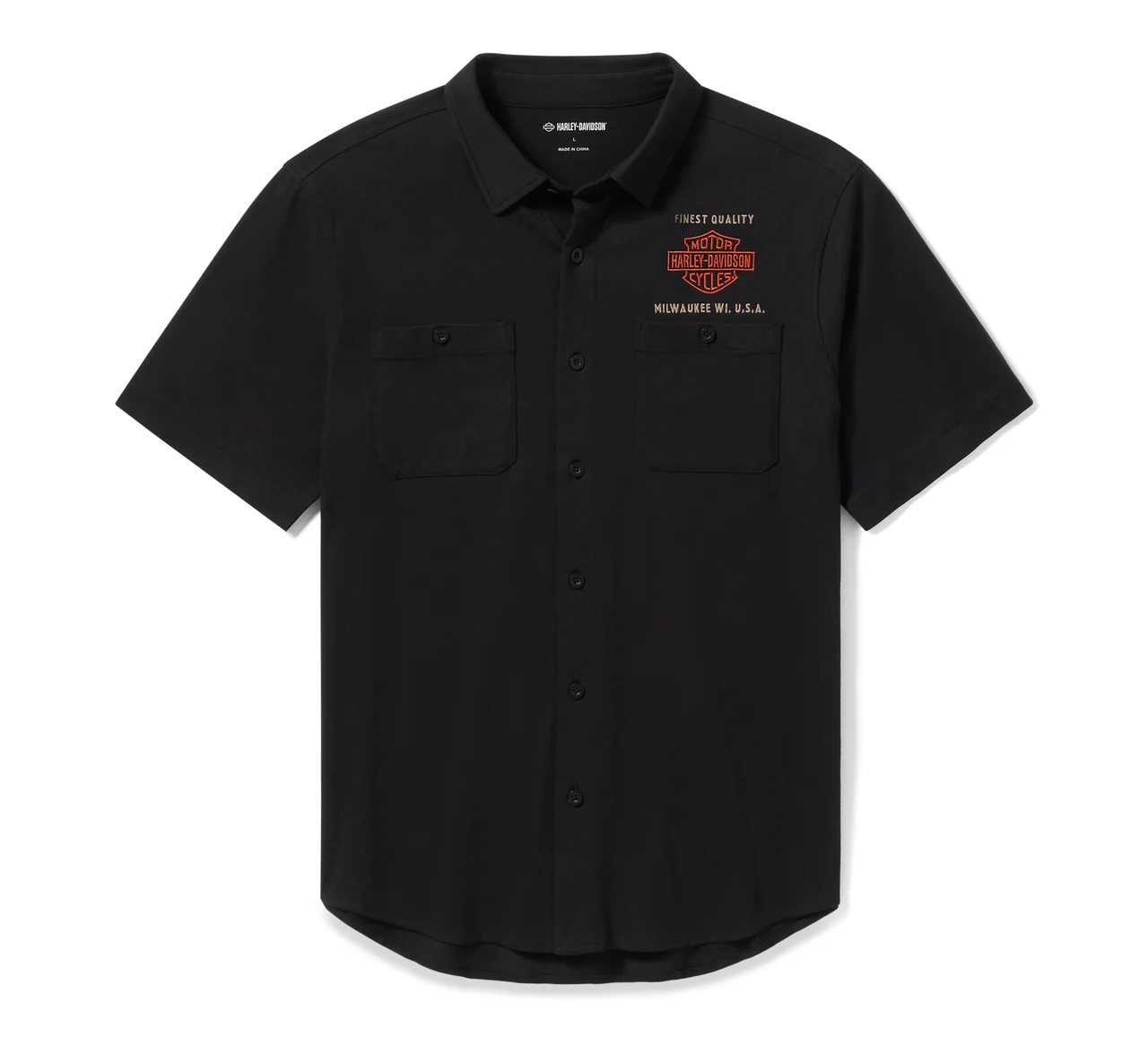 Workwear-inspired style meets longwearing comfort on our Parts & Service Jersey Button-Up Shirt. It’s crafted from breathable cotton jersey that’s washed for softness and a worn-in feel. This men’s short sleeve shirt features a shirttail hem that looks great tucked in or out, plus a hidden snap-down collar that won’t flap around under riding gear. Finished with custom embroidered graphics inspired by our archives that nod to the pros who keep us on the open road.