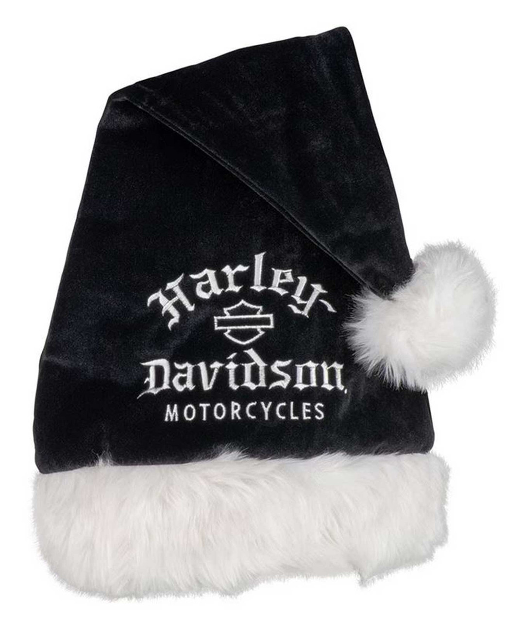 Harley-Davidson® Old English Logo Holiday Santa Hat HDX-99309 - Black & White. Velvet-feel Santa hat with white faux fur trim and elastic band.